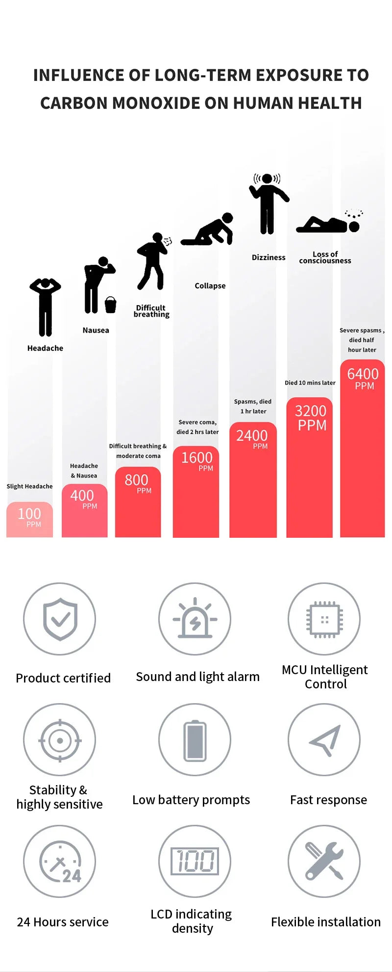 • LCD Digital Display :The LCD digital display makes it easy to read and understand the carbon monoxide levels in your home, providing real-time information at your fingertips.
